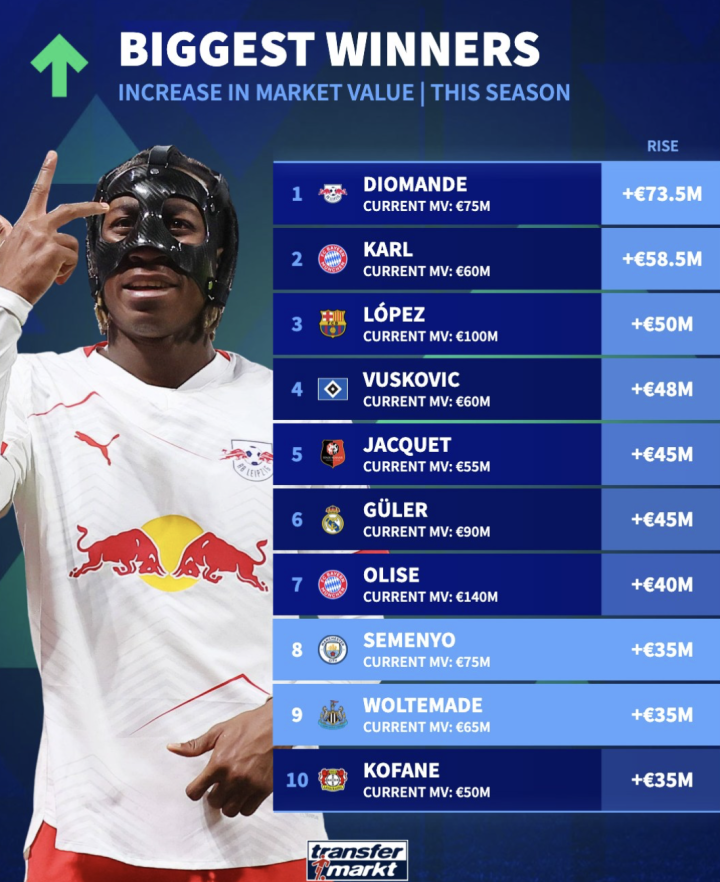 莱比锡的迪奥曼德涨幅达7350万欧高居榜首;拜仁的卡尔以5850万欧的涨幅排名第二;巴萨的费尔明涨幅5000万排名第三。