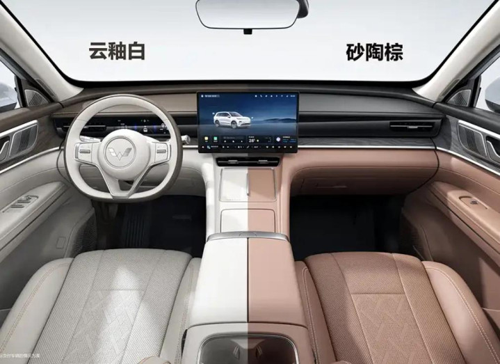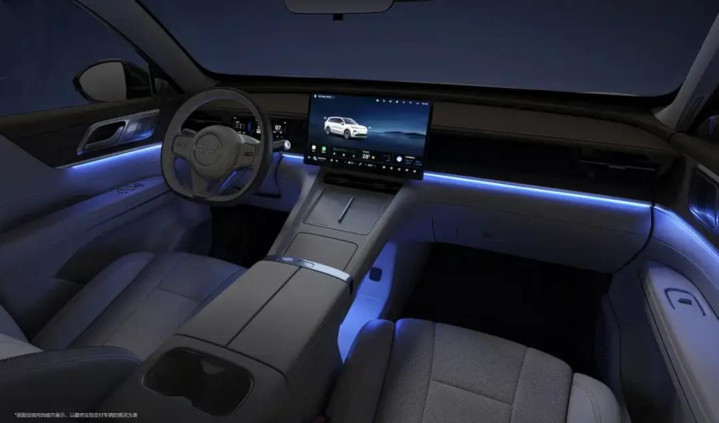 内饰比较简约,提供云釉白、砂陶棕两种配色,中控整体呈现对称的T型布局,使用了8.8英寸仪表屏+15.6英寸中控屏,智能层面据说搭载联发科MT8666芯片+Ling OS灵犀系统。配备256色全色域呼吸氛围灯,副驾老板键、二排小桌板等配置。