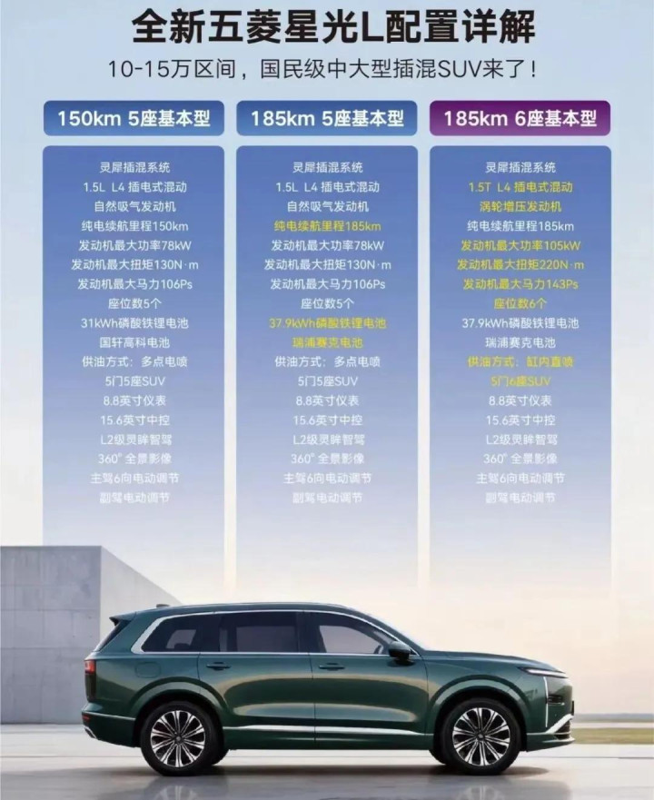 近日,五菱汽车发布旗下全新SUV——五菱星光L官图,新车定位中大型六座SUV,车长近5米,轴距2米95,提供1.5L/1.5T插混动力可选,将于2026年北京车展正式亮相。